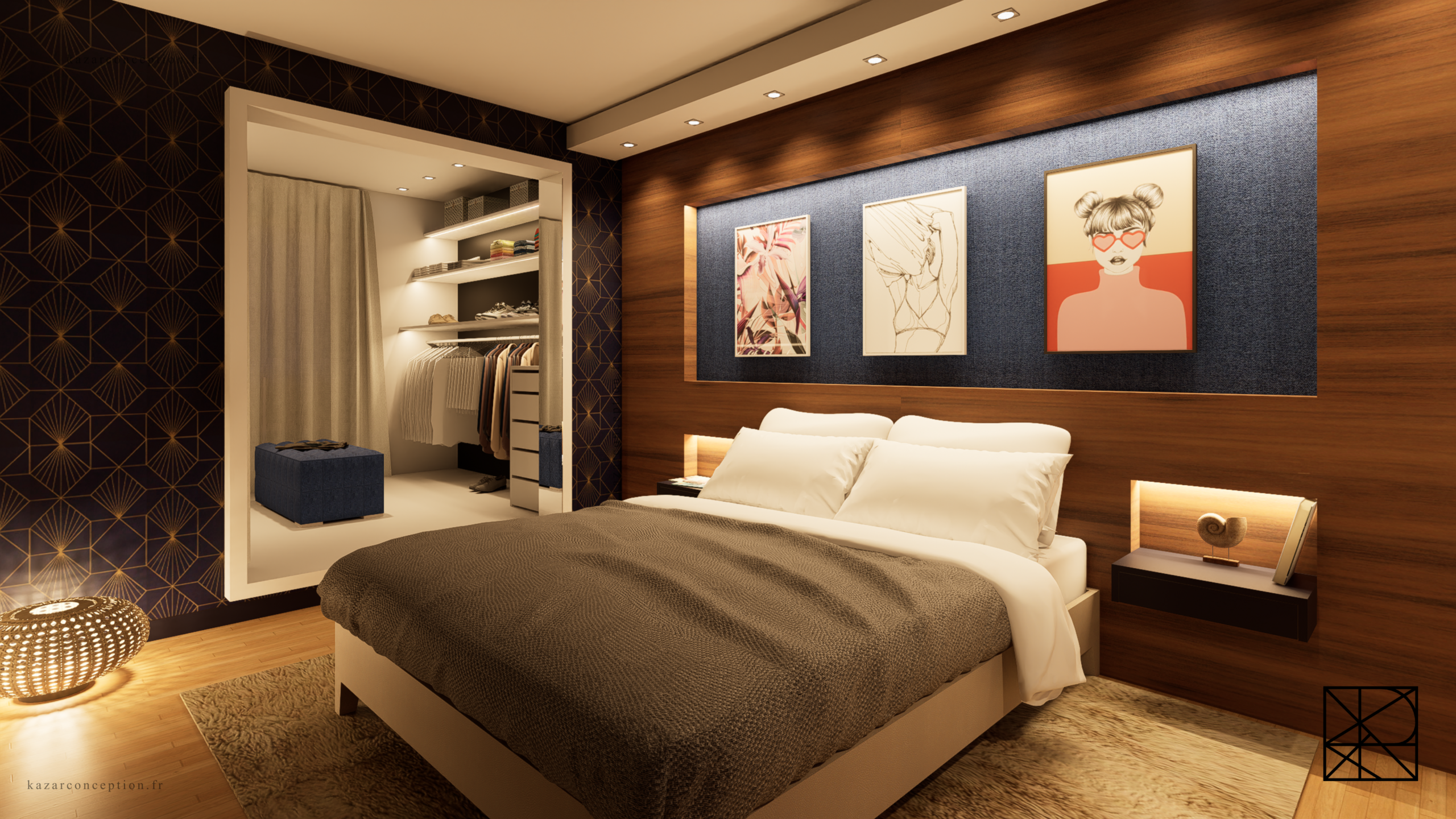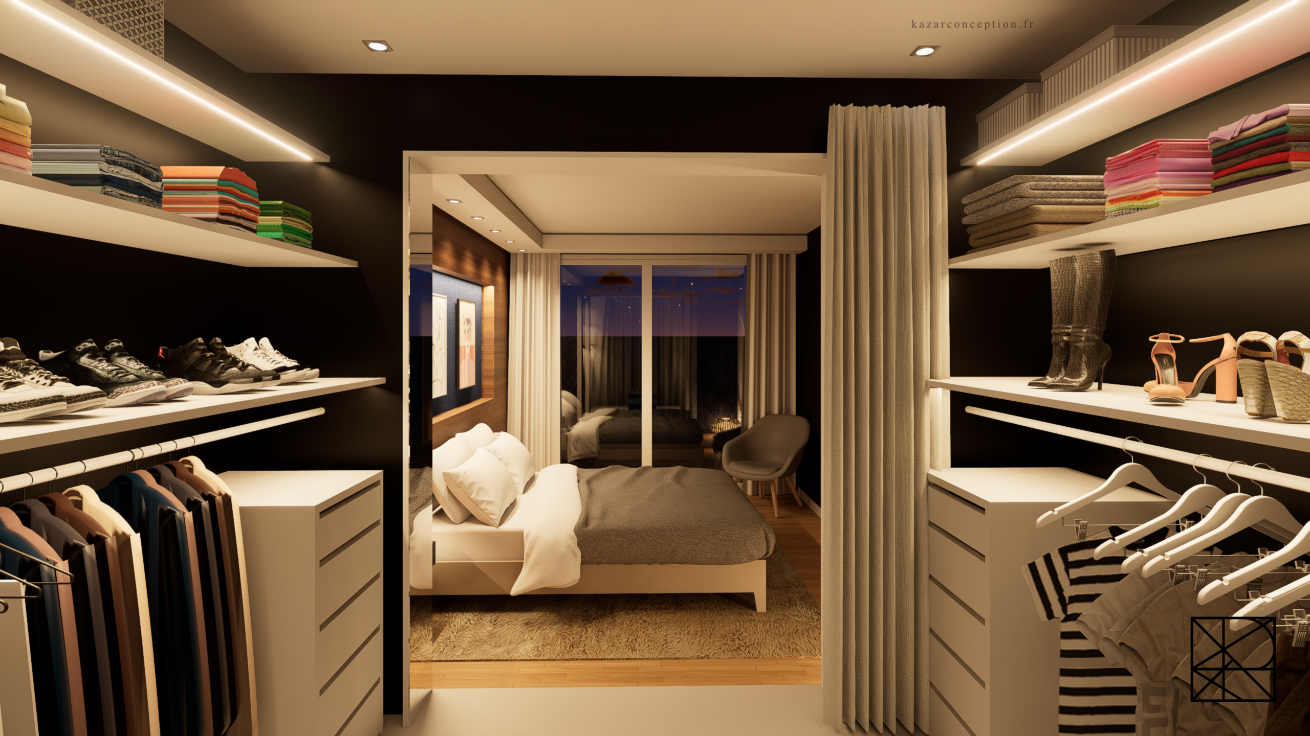 Création d’un dressing intégré à la chambre et conçu comme une alcôve surélevée